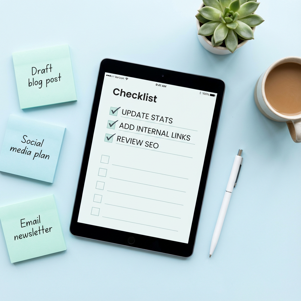 Quick checklist to score posts (0-10): recent impressions (0-3), keyword intent (0-3), backlinks/CTA value (0-2), update complexity (0-2). Refresh high scorers first.